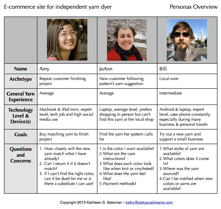 Long-term yarn store employees have a great sense of the types of people who come in to shop or call with questions along with the goals and concerns those people have. After the information gathering sessions I compiled these insights into customer archetypes.